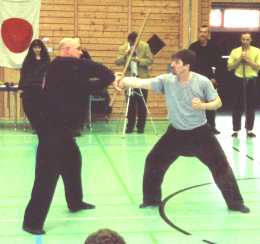 "Let your brain outsite ...". Mit diesen Worten eröffnete Sveneric Bogsäter sein zweitägiges Seminar in Bayreuth. Ungefähr 80 begeisterte Anhänger des Bujinkan Budo Taijutsu aus Österreich, der Schweiz und Deutschland nutzten die Chance eines der wenigen Seminare von Sveneric in Mitteleuropa zu besuchen. Dem von Hatsumi Sensei für dieses Jahr benannten Thema folgend (Gyokko Ryu Kosshijutsu und Daisho Sabaki), begann Sveneric das Seminar mit einigen sehr wichtigen Erläuterungen zur Sanshin no Kata. Er verwies dabei insbesondere auf den direkten Zusammenhang zwischen Kosshijutsu und Koppojutsu. Beide Grundprinzipien sollen als Einheit verstanden werden. Aus diesem Grund sollten wir darauf achten, die im letzten Jahr schwerpunktmäßig vermittelten Grundlagen mit in das diesjährige Training einzubauen. Zu Beginn des Trainings versuchten wir uns innerhalb der Sanshin no Kata einfach nur natürlich zu bewegen. Der Focus lag dabei also nicht auf der Durchführung der einzelnen Techniken sondern vielmehr auf dem Erkennen des Zusammenspiels der einzelnen Körpergruppen bei der Umsetzung einer Bewegung. Wärmend des Trainings dieser Grundlagen verwies Sveneric immer wieder auf die Bedeutung des konzentrierten Trainings mit Blick für einzelne Details ohne jedoch den Gesamtzusammenhang der Grundprinzipien aus den Augen zu verlieren. So haben wir die Sanshin no Kata Element für Element (chi, sui, ka, fu, ku) separat erarbeitet, jedes Element mit seinen spezifischen Emotionen versucht zu "erleben", um letztendlich alles wieder zu einem Gesamtprinzip, dem grundlegenden Prinzip des Gyokko Ryu Koshijutsu, zusammenzuführen. Kombiniert haben wir diese Basiselemente des Bujinkan Budo Taijutsu mit einem für viele von uns völlig neuen Grundprinzip, das sich Jiryoku oder Fusui nennt. Diese Gefühl kann auch als eine Art magnetische Kraft zwischen Tori und Uke verstanden werden, die dazu führt, das sich Angreifer und Verteidiger wie zwei gleichgepolte Magnete zueinander verhalten. Viele von uns bekamen in diesen Trainingsstunden das erste mal eine ungefähre Idee, worin das "Geheimnis" der Sanshin no Kata bestehen könnte. In einem nächsten Schritt versuchten wir die zuvor trainierten Grundprinzipien auf unser Kihon Happo zu übertragen. Nach einem sehr intensiven ersten Trainingstag nutzten sehr viele die Gelegenheit auf der traditionellen Seminarparty ihr Wiedersehen zu feiern oder über die neuesten Neuigkeiten zu plaudern. Wolfgang Gröger sorgte als musikalischer Alleinunterhalter dafür, das die gute Stimmung während des gesamten Abends nicht abriss. Am zweiten Tag trainierten wir verschiedene Grundlagentechniken aus einzelnen Bereichen des Gyokko Ryu Kosshijutsu (Jo und Chu Ryaku no Maki). Den Schwerpunkt bildete dabei ein mit der Ten Chi In Yo no Kamae verbundenes Grundverständnis, das sich unter anderem in der Ausgewogenheit dieser Kamae und der damit einhergehenden harmonischen Bewegung wiederspiegelt. Während des gesamten Seminars und besonders am Ende des zweiten Seminartages erklärte uns Sveneric wieder und wieder, wie wichtig es ist und was es bedeutet "richtig zu trainieren". "Es ist nicht wichtig wie oft Ihr trainiert (solange es mindestens zweimal in der Woche ist). Es ist wichtig wie Ihr trainiert!" waren seine Worte mit denen er das Sonntagstraining beendete. Er verwies auch noch einmal darauf, das es nicht ausreiche nur Seminare zu besuchen. Seminare geben nur eine Perspektive einen Einblick in verschiedene Wege. Der Besuch des regulären Trainings jedoch schult das Grundlagenverständnis und ist deswegen weit wichtiger. Nach dem Seminar waren alle Teilnehmer sehr dankbar für die sehr tiefen und teilweise neuen Einblicke, die uns Sveneric gegeben hat. An dieser Stelle daher noch einmal: Vielen Dank Sveneric - wir freuen uns auf das nächste Seminar! Ein Dankeschön an die vielen fleißigen Helfer, insbesondere auch an Ingeborg und Wolfgang Gröger, ohne die die Organisation dieses Seminares mit Sicherheit nicht so gut gelaufen wäre. Und zuletzt natürlich noch ein Dankeschön an alle Teilnehmer, die mit Ihrem Kommen dieses harmonische Seminar erst möglich gemacht haben. Cavin Pietzsch |
