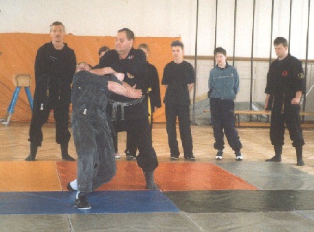 Das Bujinkan-Gröger-Dojo Netzschkau gehört sicher zu den jüngsten und kleinsten Schulen, die der IAWO angehören. Dennoch bat Dojo-Leiter Ralf Kürschner seinen Lehrer und Mitgründer des BGDN Shihan Wolfgang Gröger (10. Dan), kurzfristig einen Lehrgang in Reichenbach abzuhalten. Obwohl Grögers Terminkalender stets einige Termine aufweist, ließ er auch diesmal seine Schützlinge aus dem sächsischen Vogtland nicht lange warten. So besuchte Gröger am 20.04.2002 das BGDN in seiner Trainingshalle in Reichenbach. Einige Mitglieder des BGDN kannten ihren Meisterlehrer bereits von anderen Lehrgängen und freuten sich sehr über das Wiedersehen. Und nach ein paar einführenden Worten begann Gröger auch gleich mit dem Training. Dr. Masaaki Hatsumi Sensei aus Japan hat für dieses Jahr als Schwerpunkttraining „Takagi Yoshin Ryu Ju-Taijutsu“ bestimmt. Damit war auch für diesen Lehrgang das Grundthema festgelegt. In Takagi Yoshin Ryu dominieren Hebeltechniken und Angriffe auf Schmerzpunkte. Und jeder der Shihan Gröger näher kennt, weiß, dass diese Techniken zu seinem absoluten Spezialgebiet gehören. Damit stand fest, dass das Seminar für Anfänger ebenso wie für Meisterschüler interessant und lehrreich sein würde. Sicher ein Grund für den Leiter der Schweinfurter Tea-Ki-Do-Schule Shihan Jürgen Kampa (6. Dan) und Grögers Meisterschüler Frank Seidel (3. Dan) aus Zwickau sich diesen Lehrgang nicht entgehen zu lassen. Natürlich zeigte sich schnell, dass die neuen Mitglieder des BGDN mit komplizierten Hebeln noch große Schwierigkeiten haben. Aber Gröger verstand es, die Techniken so geschickt zu variieren und zu erklären, dass es alle nach wenigen Versuchen nachmachen konnten. Immer wieder machte Gröger deutlich, dass es große Unterschiede von traditionellen Techniken zur modernen Selbstverteidigung gibt. Dennoch haben die Verteidigungstechniken den gleichen Ursprung, und das traditionelle Training bildet mit seinen Grundtechniken ein solides Fundament für die Selbstverteidigung in der heutigen Zeit. Unter diesem Gesichtspunkt erklärte Gröger auch, wie sich einzelne kleine Techniken zu einer effektiven starken Verteidigung harmonisch zusammenfügen lassen. Um diese Wechselwirkungen besser zu verdeutlichen, demonstrierte Gröger zunächst einige kleinere Techniken wie Fingerhebel, Handhebel oder Angriffe auf Nervenpunkte und andere empfindliche Stellen. Danach zeigte er traditionelle Techniken aus der Takagi Yoshin Ryu und machte deutlich, wie ein einfacher Armstreckhebel durch Zwicken in die Hautpartien des Oberarms und gleichzeitiges Verbiegen von ein oder zwei Fingern so extrem verstärkt werden kann, dass der Gegner keinen einzigen klaren Gedanken an eine eventuelle Gegenwehr findet. Natürlich lassen sich solche Kombination mit allen beliebigen Techniken verknüpfen. Gröger zeigte aber auch auf, wie wichtig solche Feinheiten für Hebel oder auch Würfe sind. „Der entstehende Schmerz oder entsprechende Ablenkung machen Hebel erst möglich.“ Oft versuchen körperlich schwächere Hebeltechniken an stärkeren Gegnern. Und ebenso oft scheitern sie bereits daran, dass der Gegner allein mit Kraft gegen den Hebel ankämpft. Um dies zu unterbinden zeigte Gröger verschiedene Möglichkeiten, den Gegner mit gezielten Griffen auf Nervenpunkte „gefügig“ zu machen. Schnell zeigte sich, dass es immer eine Weg gibt, einen Hebel an körperlich stark überlegeneren Gegnern auszuführen. Natürlich beinhaltet auch Takagi Yoshin Ryu Ju-Taijutsu den Waffenkampf. So ging Gröger im zweiten Teil des Lehrgangs zu diesem Bereich über. Da im mittelalterlichen Japan die üblichste Waffe der Samurai das Schwert war, finden sich in jeder der 9 traditionellen Ninjutsu-Stile, die im Budo-Taijutsu unter Dr. Hatsumi zusamengefasst sind, viele Techniken, sich waffenlos gegen einen Schwertangriff zu wehren. Einige dieser Techniken zeigte Gröger den begeisterten Teilnehmern vor, verwies jedoch auf die Benutzung von Bokken (Holzschwert) beim üben, um keine Verletzungen zu riskieren. Generell ist bei der IAWO das Benutzen von Stahlklingen nur den Meistern und dann auch nur zu Demonstrationszwecken vorbehalten. Gröger selbst zeigte seine übungen mit einem Katana (Samuraischwert) vor, um zu verdeutlichen, welche Bewegungen wichtig sind, um dem Gefahrenbereich der Klinge zu entgehen und wie Techniken ausgeführt werden müssen, damit man nicht in die scharfe Klinge fasst oder sogar „hinein rennt“. Gröger ließ den Teilnehmern genügend Zeit, sich mit den Techniken vertraut zu machen und zu üben. Dabei beobachtete er aufmerksam und korrigierte geduldig die Fehler, welche sich gerade bei den Anfängern schnell einschlichen. Sicher eine Eigenschaft, die einen wirklichen Lehrer kennzeichnet. Nach über 3 Stunden beendete Gröger den Lehrgang. Geschafft aber sehr glücklich bedankten sich die Schüler bei Ihrem Shihan für dieses hervorragende Seminar mit einem kräftigen Applaus. Natürlich hoffen wir auf ein baldiges Wiedersehen auf künftigen Lehrgängen und sicher auch einmal wieder in Reichenbach. Ralf Kürschner |