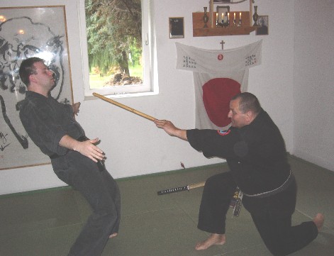 Wolfgang Gröger(rechts) wehrt einen Angriff mit dem Bokken (Holzschwert) von Ralf Kürschner mit dem Hanbo ab. |