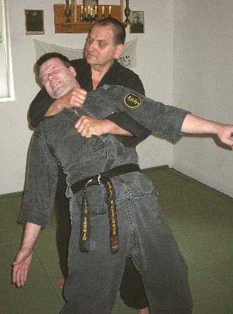 Am 8.8.2004 fanden sich wieder viele Teilnehmer der Lehrgangsreihe zum Prüfungsprogramm Budo Taijutsu in Bayreuth ein. Dieses Mal war der höchste Kyu- (= Schüler-)Grad, der 1. Kyu Budo Taijutsu Lehrgangsinhalt. Nachdem alle Teilnehmer eingtroffen waren, die, wie schon so oft zuvor, teilweise eine lange Anreise auf sich genommen hatten, begrüßte Wolfgang Gröger, 10. Dan Budo Taijutsu Shidoshi, die Anwesenden und startete den Lehrgang mit einem Aufwärmtraining. Im Anschluss ging es gleich mit dem eigentlichen Lehrgang los. Zunächst standen dabei die Weiterführungstechniken auf dem Programm. Weiterführungstechniken sind im Gegensatz zu den Gegentechniken solche Techniken, die nach dem Scheitern einer Technik folgen, um dennoch die Kontrolle über die Situation zu behalten. Gegentechniken, die gleich im Anschluss erläutert wurden, sind demhingegen Techniken, die einen Angriff durch einen Gegner, der seinerseits mit gezielten, eintrainierten Techniken agiert, abwehren und kontern. Wolfgang Gröger zeigte dazu einige Beispiele und ließ die Teilnehmer ihrerseits entsprechende Techniken üben. Dabei legte er Wert auf geeignete Kontertechniken. Als Nächstes folgte die freie Abwehr von einem oder zwei Angreifern. Hierbei wird der Angriff nicht angesagt, sondern frei ausgeführt. Bei zwei Angreifern ist es wichtig, keinem der Angreifer den Rücken zuzuwenden und zu versuchen immer den Angreifer, der einem am nächsten ist zwischen sich und dem verbleibenden Angreifer zu bringen, um sich genügend Distanz zum zweiten Angreifer zu halten, um durch diesen nicht in Gefahr zu geraden. Daraufhin folgten Techniken gegen Schwertangriffe, bei denen man sich ohne Waffen, mit einem eigenen Schwert, dem Hanbo oder Jutte behelfen können soll. Wichtig ist vor allem immer dem Gefahrenbereich, also dem Weg des angreifenden Schwertes vollständig zu entgehen, oder dem Angriff zuvorzukommen. Daraufhin folgte ein kurzer Teil zum Randori, dem Freikampf mit und ohne Kontakt, wie er beispielsweise ähnlich als Randori im Jodo oder Kumite im Karate bekannt ist. Dieser Teil ging über in den nächsten Part der Prüfungsordnung, der Verteidigung in der Bodenlage mit und ohne Kontakt, in dem die Teilnehmer wie immer reichlich Gelegenheiten zum trainieren hatten. Im Folgenden Ju Tai Jutsu waren Shikaashi und Jigoku Otoshi Inhalt des Lehrgangs. Beim Shikaashi kontert man den Tritt des Angreifers indem man mit dem eigenen Bein das Standbein des Gegners hebelt. Im Jigoku Otoshi hebelt man ein abgefangenes Trittbein mit dem Arm. Torite Kihon Gata beinhaltete die Techniken Omote Oni Kudaki und Ura Oni Kudaki, zwei sehr effektive Hebeltechniken, sowie Temakura, einem Wurf, bei dem man das Bein des Gegners mit dem eigenen blockiert und über einen Hebel am Unterarm und gleichzeitigem Sturz rückwärts den Gegner mit zu Boden reißt. Bei Shime Waza Kihon Gata wurden verschiedene Arten zu Würgen sowie ihre Abwehr gezeigt. Im einzelnen waren hierbei Hon Jime, Gyaku Jime, San Kaku Jime und Eri Jime Lehrgangsinhalt. Die Teilnehmer wurden beim üben dieser Techniken immer wieder zur Vorsicht ermahnt, da ein Würgeangriff eine sehr gefährliche Angelegenheit und somit gerade hier ein verantwortungsbewußter Umgang mit den Trainingspartnern wichtig ist. Zudem sind gerade die Gegentechniken für die Verteidigung wichtig, da einem nicht viel Zeit bleibt, sich zu wehren. Bei Shime Hodoki wurden Shime Hodoki Temakura, San Kaku Jime Hoshi Dori Nage und San Kaku Jime zu Dori Nage gezeigt und geübt, wobei auch hier wieder ausgiebig von den Teilnehmern unter der Anleitung von Wolfgang Gröger trainiert wurde. Im Abschnitt Kyusho wurden Punkte am Körper gezeigt, die man als Kampfsportler kennen sollte, um sich der Risiken durch Verletzungen oder Gewalteinwirkung auf diese Punkte bewusst zu sein. Nur so ist ein verantwortungsbewußtes Training möglich. Ju Tai Jutusu beinhaltet zu diesem Kyu-Grad den Beinstreckhebel, den Armriegel von innen sowie von außen, den Beindurchzug, den Körperrückstoß und den Körperrückriß, den Beinriß und Beinrückriß. Auch hier konnten sich die Teilnehmer von der Wirksamkeit dieser Techniken im eigenen Training überzeugen. Abschließend ging Wolfgang Gröger noch auf das Kiai Jutsu ein, insbesondere auf verschiedene Kiai Lautarten, Kiai Arten und deren Anwendungen. Kiai ist vielmehr als nur der bloße Schrei, als den viele den Kiai verstehen, sondern vielmehr ein Ausdruck von äußerster Entschlossenheit. Zum Abschluss bedankte sich Wolfgang Gröger von den Teilnehmern für ihr Interesse und ihre Aufmerksamkeit. Die Teilnehmer ihrerseits bedankten sich bei Wolfgang Gröger für den gelungenen und vielseitigen Lehrgang. Christian Daller |