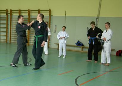 Parallel dazu unterrichtete Ralf Kürschner Anti-Terror-Karate. Hier standen Techniken im Vordergrund, die den Angreifer schnell Kampfunfähig machen und in eine für nachfolgende Transporttechniken günstige Lage brachten. Auch die Transportgriffe und ihre Einsatzmöglichkeiten waren Bestandteil dieser ersten Einheit. Im zweiten Teil kam der Tonfa und der Polizeischlagstock zum Einsatz. Nach einigen Grundschlägen und Stößen wurde mit dem Tonfa am Partner gearbeitet. Aufbauend an die vorangegangene Einheit konnten die Teilnehmer unter der Anleitung von Ralf Kürschner die zuvor gelernten Techniken nun in Verbindung mit dem Tonfa umsetzen. Zum Abschluss zeigte Kürschner noch einige Beispiele, wie der Tonfa bei Polizei und Sicherheitsfachkräften eingesetzt wird. So kann man damit beispielsweise den Angreifer am Ziehen einer Pistole hindern oder zwei Tonfas als Steighilfe beim überwinden eines hohen Maschendrahtzauns einsetzen.