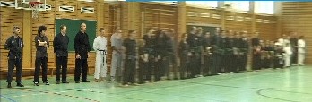 Zeitgleich konnten diejenigen, die nicht am Wettkampf teilnehmen wollten bei Ralf Kürschner (Renshi 5. Dan) All-Style-Karate trainieren. Hierbei standen Schlag- und Trittkombinationen am Partner im Vordergrund, welche dann in die praktische Anwendung im Selbstverteidigungsbereich umgesetzt wurden. Am Ende der Einheit brachten die Kursteilnehmer die Halle mit gemeinsamem „Kiai“ (Kampfschrei) bei gleichzeitig ausgeführter Schlagtechnik fast zum Erzittern. Parallel hierzu unterrichtete Frank Heuberger (1. Dan) Techniken aus dem Jeet-Kune-Do / Jun Fan Gung Fu. Dieses von dem legendären Bruce Lee zusammengesetzte Kampfsystem bildete eine interessante Alternative für die neugierigen und begeisterten Kursteilnehmer. Gleichzeitig ging es in der Nachbarhalle zunächst etwas ruhiger zu. Hier stand Stretching auf dem Programm. Europameister und World-Cup-Sieger Thomas Renner (Renshi 4. Dan) zeigte den Kursteilnehmern verschiedene Möglichkeiten in Theorie und Praxis, die Dehnbarkeit und Elastizität ihres Körpers zu steigern. Dies war auch Vorbereitung auf seinen nachfolgenden Kurs, bei dem „Kicking“ (spezielle Tritttechniken) auf dem Programm standen. Hierbei waren neben den Techniken auch Distancegefühl und Partnerübungen für Kraft und Ausdauer die wesentlichen Schwerpunkte. Und noch ein weiterer Kurs fand zeitgleich statt: Eskrima mit David Müller. Hierbei wirbelten die beiden ca. 80 cm langen Stöcke durch die Luft. Das gleichzeitige Führen stellte doch schon einige Anforderungen an die Koordinationsfähigkeit der übenden. David Müller gab den übenden jedoch reichlich Zeit und Unterstützung, um das Ausführen der Bewegungsabläufe zu erlernen. Nach der Mittagspause ging es weiter. Dr. Frank Rösch vermittelte für interessierte Teilnehmer Wissenswertes über die medizinische Hilfe bei Unfällen im Kampfsporttraining. Ebenso hatten die Teilnehmer endlich einmal die Gelegenheit, den ehemaligen Unfallarzt mit jahrelanger praktischer Erfahrung im Hubschrauber- und Unfallwageneinsätzen all das zu fragen, was sie interessierte. In lockerer Atmosphäre lies Dr. Frank Rösch keine Fragen offen. Es war eine entspannte Einheit bevor sich auch diese Teilnehmer wieder ins „Kampfgeschehen“ stürzten. Auch Straßenkampf mit Wolfgang Gröger stand auf dem Programm. Und hier zeigte der Experte wieder einmal, dass er zu recht zu den vielseitigsten und erfahrendsten Budo-Allroundern gehört. Schwerpunkt waren der Einsatz aller verfügbaren Mittel sowie verschiedener Alltagsgegenstände. Wolfgang Gröger verblüffte die Teilnehmer mit seinem schier endlosen Repertoire an Tricks und Kniffen, um den Angreifer abzuwehren. Gleichzeitig unterrichtete Walter Neubauer einige Teilnehmer in den Techniken des Mittelalterlichen Europäischen Schwertkampfes. Er zeigte die Verwendung der verschiedenen Waffen und machte deutlich, dass auch in Europa ähnliche Techniken Anwendung fanden, die den Budo-Freunden aus den asiatischen Kampfsystemen bekannt waren. Parallel dazu unterrichtete Jürgen Kampa zwei Einheiten Tae-Ki-Do und Kobudo. Hierbei kamen die speziellen Waffen der japanischen Bauern zum Einsatz. Der Sai (ein etwa 50 cm langer Metallstab mit kurzem Griff und angeschliffener Spitze, an dem zwei sich gegenüberliegende, zur Spitze hingebogenen Zinken von bis zu 15 cm Länge befinden – diese Waffe wurde von den Bauern als Heugabel verwendet), die Kama (eine einfache Reissichel), der Hanbo (Stock etwa 90 cm lang) und der Bo (Stock ca. 180 cm lang) kamen in dieser interessanten Einheit zum Einsatz. Die Handhabung der Sai und Kama erforderte zusätzliches Koordinationsvermögen, da diese Waffen in der Regel paarweise benutzt werden. Leider mussten die ausgeschriebenen Kurse für Ju-Jutsu mit Vice-Präsident Markus Wenzel (Shihan 7. Dan) abgesagt werden, da dieser aufgrund einer Muskelverletzung ausfiel. Ersetzt wurden diese Lehrgangseinheiten von David Müller, der die Teilnehmer in speziellen Techniken des Bodenkampfes unterrichtete. Hierbei standen Techniken mit Widerstand des Gegners im Vordergrund, wie sie im Judo, Ju-Jutsu u. ä. sportlichen Wettkämpfen immer wieder stattfinden. Die diesen Tag abschließenden Kurse hielt Martin Ashauer mit All-Style-Karate und Kickboxen. Hierbei zeigte Martin spezielle Grundtechniken und Partnerübungen für den sportlichen Wettkampf. Rüdiger Schmiedel (Kyoshi 5. Dan) demonstrierte eindrucksvoll Techniken aus dem Traditionellen Karate. Dabei beinhaltete die erste Einheit Grundtechniken und Grundlagen, der zweite Teil das Bunkai / Kumite, bei dem festgelegte übungen mit dem Partner ausgeführt werden. Den absoluten Höhepunkt des ersten Tages bildete jedoch die Abendgala. Zunächst begrüßte der Präsident der IAWO Wolfgang Gröger die ca. 100 Zuschauer bevor er den einzelnen Sportschulen die Gelegenheit gab, einen kleinen Ausschnitt aus ihrem Trainingsprogramm zu zeigen. Er begann mit einer Demonstration der Judosektion aus Bayreuth, welche einige spezielle und sehr beeindruckende Wurftechniken zeigten.