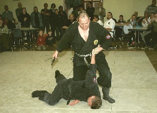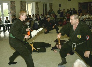 Shihan Wolfgang Gröger zeigte als Fachvertreter für Goshin-Taijutsu mit seiner Trainingsgruppe die effektive Verteidigung im Ernstfall, bei der er zum Schluss sogar einen Angriff mit einer Kettensäge abwehrte.