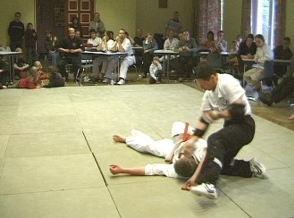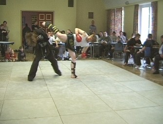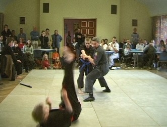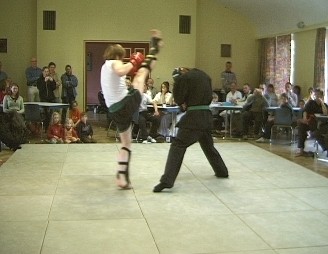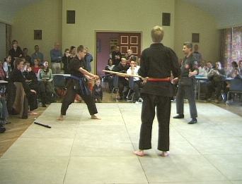 Danach zeigte Martin Ashauer (Trainer für Kickboxen an der Uni Bayreuth und Student der Uni, ebenfalls ein Schüler von Wolfgang Gröger) mit Christian Zenkel (auch ein Gröger-Schüler) einen Kickboxkampf im Leichtkontakt mit Schutzausrüstung um Verletzungen zu vermeiden.