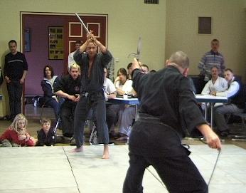 Nochmals sahen die Zuschauer eine Vorführung der unter Leitung von Präsident Wolfgang Gröger. Diesmal zeigte er zusammen mit seinen Schülern Bujinkan-Budo-Taijutsu, die Kampfkunst der früheren Ninjas. Spektakuläre Waffen brachten den Zuschauern die kompromisslose und effektive Kampfkunst näher. Schnell wurde den Zuschauern deutlich, dass Wolfgang Gröger, als direkter Schüler von Großmeister Masaaki Hatsumi (Japan), seine Graduierung (den 10. Dan Bujinkan-Budo-Taijutsu) nicht umsonst trägt.