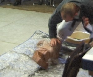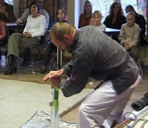 Zum Schluss zeigte Vice-Präsident Walter Neubauer (Shihan 9.Dan) zwei Bruchtests der Superlative. Zunächst zertrümmerte er zwei übereinander gelegte Ziegelsteine mit dem Handballen. Anschließend schlug er mit der Hand von oben auf die Öffnung einer mit etwas Wasser gefüllten Glasflasche und brachte diese damit zum Zerplatzen. Diese letzte Vorführung ließ unter den Zuschauern Ausrufe der Begeisterung laut werden.
