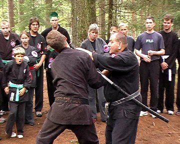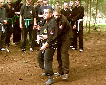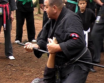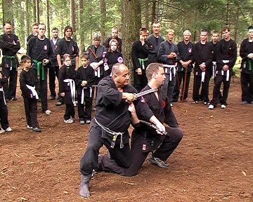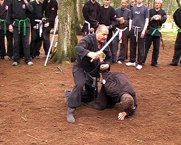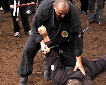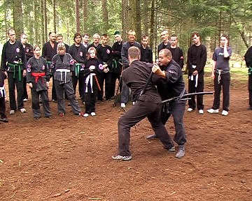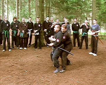 Gröger verstand es, waffenlose Techniken mit Schwerttechniken so zu kombinieren, dass den übenden die Gemeinsamkeit der Körperbewegungen deutlich wurde. So konnte das Schwert bzw. auch Daisho (langes und kurzes Schwert) gezielt und bewusst eingesetzt und jeweils durch die ganze Körperkraft unterstützt werden. Gröger demonstrierte zudem vielfältige Einsatzmöglichkeiten des Schwertes für Hebeltechniken bzw. auch den Schwertgriff als Stoßwaffe. Auch Schläge mit der Tsuba (Stichblatt oberhalb des Schwertgriffes) waren Bestandteil einiger Techniken. Am Ende des Seminars bedankte sich Gröger für die Aufmerksamkeit und das fleißige üben der Teilnehmer und verlieh zudem seinem langjährigen Meisterschüler aus Bayreuth Stephan Mai den 3. Dan in Bujinkan-Budo-Taijutsu.