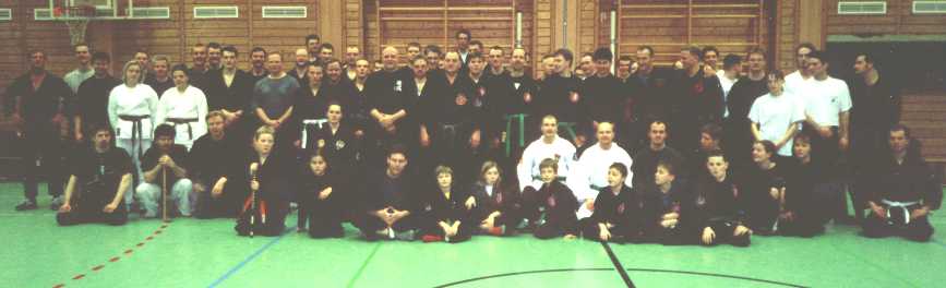 "Let your brain outsite ...". Mit diesen Worten eröffnete Sveneric Bogsäter sein zweitägiges Seminar in Bayreuth. Ungefähr 80 begeisterte Anhänger des Bujinkan Budo Taijutsu aus Österreich, der Schweiz und Deutschland nutzten die Chance eines der wenigen Seminare von Sveneric in Mitteleuropa zu besuchen. Dem von Hatsumi Sensei für dieses Jahr benannten Thema folgend (Gyokko Ryu Kosshijutsu und Daisho Sabaki), begann Sveneric das Seminar mit einigen sehr wichtigen Erläuterungen zur Sanshin no Kata. Er verwies dabei insbesondere auf den direkten Zusammenhang zwischen Kosshijutsu und Koppojutsu. Beide Grundprinzipien sollen als Einheit verstanden werden. Aus diesem Grund sollten wir darauf achten, die im letzten Jahr schwerpunktmäßig vermittelten Grundlagen mit in das diesjährige Training einzubauen. Zu Beginn des Trainings versuchten wir uns innerhalb der Sanshin no Kata einfach nur natürlich zu bewegen. Der Focus lag dabei also nicht auf der Durchführung der einzelnen Techniken sondern vielmehr auf dem Erkennen des Zusammenspiels der einzelnen Körpergruppen bei der Umsetzung einer Bewegung. Wärmend des Trainings dieser Grundlagen verwies Sveneric immer wieder auf die Bedeutung des konzentrierten Trainings mit Blick für einzelne Details ohne jedoch den Gesamtzusammenhang der Grundprinzipien aus den Augen zu verlieren. So haben wir die Sanshin no Kata Element für Element (chi, sui, ka, fu, ku) separat erarbeitet, jedes Element mit seinen spezifischen Emotionen versucht zu "erleben", um letztendlich alles wieder zu einem Gesamtprinzip, dem grundlegenden Prinzip des Gyokko Ryu Koshijutsu, zusammenzuführen. Kombiniert haben wir diese Basiselemente des Bujinkan Budo Taijutsu mit einem für viele von uns völlig neuen Grundprinzip, das sich Jiryoku oder Fusui nennt. Diese Gefühl kann auch als eine Art magnetische Kraft zwischen Tori und Uke verstanden werden, die dazu führt, das sich Angreifer und Verteidiger wie zwei gleichgepolte Magnete zueinander verhalten. Viele von uns bekamen in diesen Trainingsstunden das erste mal eine ungefähre Idee, worin das "Geheimnis" der Sanshin no Kata bestehen könnte. In einem nächsten Schritt versuchten wir die zuvor trainierten Grundprinzipien auf unser Kihon Happo zu übertragen. Nach einem sehr intensiven ersten Trainingstag nutzten sehr viele die Gelegenheit auf der traditionellen Seminarparty ihr Wiedersehen zu feiern oder über die neuesten Neuigkeiten zu plaudern. Wolfgang Gröger sorgte als musikalischer Alleinunterhalter dafür, das die gute Stimmung während des gesamten Abends nicht abriss. Am zweiten Tag trainierten wir verschiedene Grundlagentechniken aus einzelnen Bereichen des Gyokko Ryu Kosshijutsu (Jo und Chu Ryaku no Maki). Den Schwerpunkt bildete dabei ein mit der Ten Chi In Yo no Kamae verbundenes Grundverständnis, das sich unter anderem in der Ausgewogenheit dieser Kamae und der damit einhergehenden harmonischen Bewegung wiederspiegelt. Während des gesamten Seminars und besonders am Ende des zweiten Seminartages erklärte uns Sveneric wieder und wieder, wie wichtig es ist und was es bedeutet "richtig zu trainieren". "Es ist nicht wichtig wie oft Ihr trainiert (solange es mindestens zweimal in der Woche ist). Es ist wichtig wie Ihr trainiert!" waren seine Worte mit denen er das Sonntagstraining beendete. Er verwies auch noch einmal darauf, das es nicht ausreiche nur Seminare zu besuchen. Seminare geben nur eine Perspektive einen Einblick in verschiedene Wege. Der Besuch des regulären Trainings jedoch schult das Grundlagenverständnis und ist deswegen weit wichtiger. Nach dem Seminar waren alle Teilnehmer sehr dankbar für die sehr tiefen und teilweise neuen Einblicke, die uns Sveneric gegeben hat. An dieser Stelle daher noch einmal: Vielen Dank Sveneric - wir freuen uns auf das nächste Seminar! Ein Dankeschön an die vielen fleißigen Helfer, insbesondere auch an Ingeborg und Wolfgang Gröger, ohne die die Organisation dieses Seminares mit Sicherheit nicht so gut gelaufen wäre. Und zuletzt natürlich noch ein Dankeschön an alle Teilnehmer, die mit Ihrem Kommen dieses harmonische Seminar erst möglich gemacht haben. Cavin Pietzsch |
