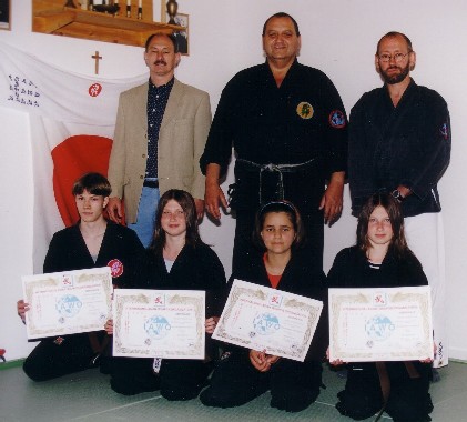 Am Samstag, dem 08.06.2002 fanden in Bayreuth Gürtelprüfungen in All-Style-Karate und Goshin-Taijutsu für Kinder und Jugendliche statt. Dabei wurde erstmals bei der IAWO der 1. Dan für Jugendliche unter 18 Jahren vergeben (Mindestalter 12 Jahre). Diese besondere Graduierung ist nur durch überdurchschnittlichen Fleiß, fachliches Können und entsprechend langjähriges Training erreichbar. Dass sich gleich 4 Schüler aus der Sportschule Gröger dieser Herausforderung stellen durften, zeigt deutlich, dass auch die jüngere Generation mit großen Ehrgeiz unter Meisterlehrer Wolfgang Gröger (10. Dan) trainiert. Bei der Prüfung wurden Schlagtechniken, Tritte, Würfe und Kombinationen abverlangt. Ebenso zeigten die Prüflinge ein Vielzahl von Hebeltechniken. Natürlich mussten die Techniken bei der Ausführung in Exaktheit und Geschwindigkeit dem Niveau eines Schwarzgurts dieser Altersgruppe entsprechen. Ein weiterer Schwerpunkt des Programms war die realistische Selbstverteidigung. Dabei zeigten die Prüflinge in hervorragender Weise, wie sie sich trotz körperlicher Unterlegenheit selbstsicher und effektiv gegen mit Stock oder Messer bewaffnete Gegner zur Wehr setzen können. In allen Fällen zeigten sich die Prüflinge unerschrocken und konterten geschickt mit wirkungsvollen Techniken. Obwohl das Prüfungsprogramm den körperlichen Fähigkeiten der Kinder / Jugendlichen angepasst wurde, stehen die Prüfungsergebnisse denen der Erwachsenen zum 1. Dan nur wenig nach. Dies bestätigten die drei Prüfer Wolfgang Gröger (10. Dan), Walter Neubauer (9. Dan) aus Bayreuth und Rüdiger Schmiedel (6. Dan) aus Bamberg nach ca. 2 Stunden harter Prüfung durch überreichung der Urkunden zum 1.Dan. Anschließend prüften Wolfgang Gröger (10. Dan) und Ralf Kürschner (4. Dan) Anwärter für Farbgurte (weiß-gelb bis blauer Gürtel). Schwerpunkt für niedrigere Graduierungen waren dabei Grundtechniken und Kombinationen. Die Vielzahl der Teilnehmer machte es nötig, die Prüflingen zum Vorführen aufzuteilen. So hatten die Prüfer jedoch eine gute übersicht und kontrollierten mit wachen Augen den Leistungsstand ihrer Schützlinge. Auch im anschließenden Teil, bei dem die Teilnehmer zeigen sollten, wie sie in Selbstverteidigungssituationen reagieren, zeigten alle, dass sie den jeweiligen gestellten Anforderungen zum nächsthöheren Schülergrad (Kyu) durchaus gerecht werden. Nach etwa einer Stunde standen die Ergebnisse fest. Gröger und Kürschner konnten allen bestätigen, dass sie ihr gestelltes Ziel erreicht hatten. Wir gratulieren allen Prüflingen zu ihrem Erfolg und danken den Trainern für Ihre Leistungen, die diese hervorragenden Ergebnisse erst möglich machten. Ralf Kürschner |
