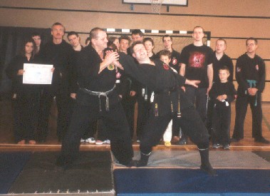 Am 09.11.02 fand in Zwickau ein Seminar für Bujinkan-Budo-Taijutsu statt. Das Ninpo-Dojo Zwickau lud dafür Meisterlehrer Wolfgang Gröger (10. Dan) als Seminarleiter zu sich ein. Schwerpunkt des Lehrgangs waren Omote-Gyaku-Henka, Ura-Gyaku-Henka und Renyo. Es handelt sich dabei um Elemente aus der Gyokko-Ryu, einer der neun Schulen, die von Dr. Masaaki Hatsumi (Japan) als Bujinkan-Budo-Taijutsu zusammengefaßt wurden. Gröger demonstrierte zunächst Omote-Gyaku (Kipphandhebel) in seiner Grundform. Er machte deutlich, worauf bei der grundschulmäßigen Ausführung zu achten ist und wie dieser Hebel mittels Druck auf Nervenpunkte des Handrückens verstärkt werden kann. Gröger verwies dabei immer wieder auf die richtige Beinarbeit und den effektiven Einsatz des ganzen Körpers. Immer wieder korrigierte er geduldig die übenden, welche schnell erkannten, wie wichtig die kleinen Feinheiten zur effizienteren Ausführung sind. Im Anschluß zeigte Gröger eine Vielzahl Variationen (Henka) des Hebels. Er zeigte, wie Gundschultechniken so verändert werden können, dass sie auf verschiedene Angriffe und auch bei stärkeren Gegnern eingesetzt werden können. Zum Schluss machte Gröger deutlich, wie dieser Hebel in Verbindung mit einem Hanbo (Stock ca. 90 cm) ausgeführt werden kann. Gröger verwies immer wieder auf den Zusammenhang von Waffenkampf zum Taijutsu (waffenlosen Kampf) und die immer wiederkehrende übereinstimmung von Kampfhaltungen und Bewegungen. Ura-Gyaku (Handdrehhebel) ist ein Art Umkehrung von Omote-Gyaku. Gröger zeigte, dass sich dieser Hebel hervorragend mit anderen Atemi-Techniken (z.B. Druck auf Nervenpunkte) kombinieren lässt. Dabei bewegte sich Gröger stets so, dass der Gegner permanent kontrolliert wurde und dieser für sich nicht die geringste Chance auf eine Gegenwehr nutzen konnte. Auch hier demonstrierte Gröger eine Vielzahl an Variationen und die Verbindung der Technik mit dem Hanbo. Die Gyokko-Ryu beinhaltet eine Menge kleiner Bewegungsabläufe (Kata), welche die elementaren Grundtechniken als Anwendung auf gegnerische Angriffe darstellen. Selbstverständlich sind diese Katas keine Kampftechniken sondern dienen vielmehr dazu, die jeweiligen Techniken besser zu verstehen und im Zusammenhang gegen einen Angriff zu erlernen. Bei Renyo handelt es sich um eine Verteidigung gegen eine Angriffskombination aus Faustschlag, Fußtritt und Reversfassen. Gröger zeigte neben der Grundform einige Variationen und ebenfalls wieder die Möglichkeit, eine Waffe (z.B. Hanbo) zum Einsatz zu bringen. Interessiert folgten die Teilnehmer den Anweisungen Grögers und versuchten soviel wie möglich aus diesem Lehrgang zu behalten. Gröger beendete den kraftraubenden Lehrgang nach ca. vier Stunden harten Trainings und wurde mit großem Applaus verabschiedet. Ralf Kürschner |