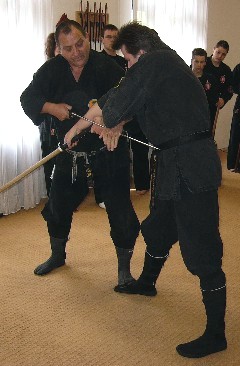 Am 24.04.2004 konnten die Mitglieder der Asian Combat Academy ihren Meisterlehrer Shihan Wolfgang Gröger (zweifacher Träger des 10. Dan) in Mylau begrüßen. Zusammen mit seiner Frau Ingeborg und seiner Enkeltochter Tina Christiansen war er wieder einmal ins schöne Vogtland gekommen, um am Fuße der Götzschtalbrücke (größte Ziegelsteinbrücke der Welt) einen Lehrgang in seiner Königsdisziplin dem Bujinkan-Budo-Taijutsu abzuhalten. Gröger ist als einer der höchstgraduiertesten Budo-Allrounder der Welt für seine hochwertigen Seminare bekannt. So reisten Kampfsportler aus Schweinfurt und Zwickau nach Mylau, um von seinem unschätzbaren Erfahrungsreichtum zu profitieren und ihre Fertigkeiten in einer Kampfkunst zu verbessern, deren Umfang so gewaltig ist, dass ein Menschenleben nicht ausreicht, um sie vollständig zu erlernen. Angefangen beim Bewegen im Gelände, waffenlosem Nahkampf, Umgang mit unzähligen Hieb- und Stichwaffen, Schusswaffenausbildung, Heilkunde, Meditation und vieles mehr gehören in das Gebiet dieser Ausbildung. Dieser Umfang lässt sich leicht erklären, wenn man sich mit der Entstehung dieser einzigartigen Kampfkunst auseinander setzt. Im mittelalterlichen Japan tobten viele Kriege unter den verfeindeten Fürstentümern um die Herrschaft über ganz Japan. Viele Schlachten wurden geführt und viel Blut vergossen. Aber es gab noch eine andere Form des Krieges, der in dieser Zeit geführt wurde. Spionage, Intrigen, Meuchelmord, Stiftung von Verwirrung und Aufruhr waren in der Regel die Aufgaben kleiner Elite-Truppen, deren Existenz und Ausbildung so geheim waren, dass viele nur eins über sie wussten: "Ninjas" die furchtlosen Dämonen, die unausweichlich den Tod bringen. In Wirklichkeit waren Ninjas natürlich keine Dämonen. Es waren Familienclans, die ihr Wissen von Generation zu Generation weitergaben, ohne es einem Außenstehenden zugänglich zu machen. Diese Clans bildeten sich zu den gefürchtesten Elite-Kämpfern des früheren Japan aus. Da niemand etwas über sie wusste, sie aus dem nichts auftauchten und wieder verschwanden, wurden ihnen bald übermenschliche Kräfte zugesprochen. Diesen Aberglauben verstärkten die Ninjas durch Einsatz von Dämonenmasken und Einsatz von geheimen Werkzeugen, die ihnen beispielsweise halfen an einer senkrechten Mauer schnell empor zuklettern. Natürlich versuchten viele hinter das Geheimnis dieser Kämpfer zu kommen und sich diese zu Nutze zu machen. Die japanische Lebensart gebot ehrenhaftes Verhalten. Ninjas übernahmen aber auch alle Aufgaben, die für den normalen Japaner ein Verstoß gegen seine Ehrenkodex gewesen wären. Bald schon wurden die Ninjas in die strategische Kriegsführung voll eingebunden. Dabei waren sie in der Regel stets auf sich allein gestellt. Sie bekamen eine Aufgabe, die sie unter allen Umständen zu erfüllen hatten. Nichts konnte sie daran hintern. Die Erfüllung ihrer Mission war mehr Wert als ihr eigenes Leben. Natürlich mussten diese Elite-Kämpfer entsprechend auf ihre Aufgaben vorbereitet werden. Allein bei der harten Ausbildung kamen einige ums Leben, die einen Augenblick unachtsam waren. Andere starben während ihrer Missionen. Nur die Besten überlebten. Und so entwickelte sich die Kampfkunst in den verschiedenen Familien zu einer Kriegskunst für Einzelkämpfer, die alles beinhaltete, was zum eigenen überleben und zum Erfüllen gefährlicher Missionen notwendig war. Erst nach der Wiedervereinigung Japans unter der Herrschaft des Shogun (mächtigster Mann des mittelalterlichen Japans; Oberbefehlshaber der Streitkräfte) waren die Dienste der Ninjas überflüssig geworden. Viele Familien wurden verfolgt und getötet. Aber Ihre Kampfkunst überlebte die Jahrhunderte im Verborgenen. Erst mit Dr. Masaaki Hatsumi Sensei wurde die alte Kampfkunst für die Öffentlichkeit publik. Neun alte Schulen wurden als Ninjutsu und später als Bujinkan-Budo-Taijutsu von Hatsumi Sensei auf der ganzen Welt verbreitet. Heute sind viele Meister dieser einzigartigen Kampfkunst als Ausbilder für Polizei, Militär und Sicherheitsfachkräfte tätig. Natürlich hat die heutige Ausbildung genauso wenig wie die Ausbildungsziele mit dem alten Ninjutsu viel gemeinsam. Die Kampfsportler, die sich dieser Kampfkunst verschrieben haben, wollen einfach nur Spaß und Freude am Training haben. Ihren Körper fit halten und ihre Fertigkeiten ausbauen. Da es jedoch die alten Kampftechniken sind, die unterrichtet werden, müssen Anhänger des Bujinkan-Budo-Taijutsu auf Wettkämpfe verzichten. Ein Regelwerk zum "Entschärfen" der Techniken für Wettkampfbedingungen würde diese Kampfkunst zu sehr beschneiden. Mit Wolfgang Gröger haben die Mitglieder der ACA einen Meisterlehrer, der bereits weit über 40 Meistergrade in verschiedenen Nahkampfsystemen hat, vor einigen Jahren den 12. Dan in Goshin-Taijutsu verliehen bekam und inzwischen auch den 10. Dan in Bujinkan-Budo-Taijutsu aus den Händen seines direkten Lehrers Dr. Masaaki Hatsumi Sensei erhalten hat. Mit dem Lehrgang in Mylau stellte er sein Wissen und können wieder einmal den begeisterten Schüler zur Verfügung. Mit 15 Teilnehmern war das kleine Dojo der ACA gut gefüllt, und die Teilnehmer mussten beim üben schon etwas auf ihre Nachbarn achten. Gröger begrenzet den Lehrgang auf Techniken aus dem Ninja-Biken (Schwertkampf), einigen Techniken mit dem Hanbo (Stock ca. 90 cm) und dem Tai-Jutsu (waffenloser Nahkampf), dem Teilgebiet "San Kaku Jime" (Abwehr von Würgeangriffen). Zunächst übten die Teilnehmer Schwertschnitte und Stiche aus den verschiedenen Grundstellungen. Gröger machte deutlich, wie wichtig der richtige Körpereinsatz ist, um die Techniken effektiv auszuführen. Dabei zeigte er auch, wie der Griff des Schwertes als Waffe eingesetzt werden kann, um Schläge, Stöße oder Hebel auszuführen. Der letzte Teil gehörte der Abwehr von fliegenden Gegenständen mit dem Schwert. Gröger brachte zum üben kleine Kunststoffscheiben mit, die ein gefahrloses ü