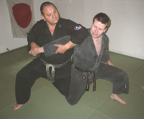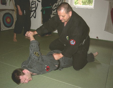 Am 8.8.2004 fanden sich wieder viele Teilnehmer der Lehrgangsreihe zum Prüfungsprogramm Budo Taijutsu in Bayreuth ein. Dieses Mal war der höchste Kyu- (= Schüler-)Grad, der 1. Kyu Budo Taijutsu Lehrgangsinhalt. Nachdem alle Teilnehmer eingtroffen waren, die, wie schon so oft zuvor, teilweise eine lange Anreise auf sich genommen hatten, begrüßte Wolfgang Gröger, 10. Dan Budo Taijutsu Shidoshi, die Anwesenden und startete den Lehrgang mit einem Aufwärmtraining. Im Anschluss ging es gleich mit dem eigentlichen Lehrgang los. Zunächst standen dabei die Weiterführungstechniken auf dem Programm. Weiterführungstechniken sind im Gegensatz zu den Gegentechniken solche Techniken, die nach dem Scheitern einer Technik folgen, um dennoch die Kontrolle über die Situation zu behalten. Gegentechniken, die gleich im Anschluss erläutert wurden, sind demhingegen Techniken, die einen Angriff durch einen Gegner, der seinerseits mit gezielten, eintrainierten Techniken agiert, abwehren und kontern. Wolfgang Gröger zeigte dazu einige Beispiele und ließ die Teilnehmer ihrerseits entsprechende Techniken üben. Dabei legte er Wert auf geeignete Kontertechniken. Als Nächstes folgte die freie Abwehr von einem oder zwei Angreifern. Hierbei wird der Angriff nicht angesagt, sondern frei ausgeführt. Bei zwei Angreifern ist es wichtig, keinem der Angreifer den Rücken zuzuwenden und zu versuchen immer den Angreifer, der einem am nächsten ist zwischen sich und dem verbleibenden Angreifer zu bringen, um sich genügend Distanz zum zweiten Angreifer zu halten, um durch diesen nicht in Gefahr zu geraden. Daraufhin folgten Techniken gegen Schwertangriffe, bei denen man sich ohne Waffen, mit einem eigenen Schwert, dem Hanbo oder Jutte behelfen können soll. Wichtig ist vor allem immer dem Gefahrenbereich, also dem Weg des angreifenden Schwertes vollständig zu entgehen, oder dem Angriff zuvorzukommen. Daraufhin folgte ein kurzer Teil zum Randori, dem Freikampf mit und ohne Kontakt, wie er beispielsweise ähnlich als Randori im Jodo oder Kumite im Karate bekannt ist. Dieser Teil ging über in den nächsten Part der Prüfungsordnung, der Verteidigung in der Bodenlage mit und ohne Kontakt, in dem die Teilnehmer wie immer reichlich Gelegenheiten zum trainieren hatten. Im Folgenden Ju Tai Jutsu waren Shikaashi und Jigoku Otoshi Inhalt des Lehrgangs. Beim Shikaashi kontert man den Tritt des Angreifers indem man mit dem eigenen Bein das Standbein des Gegners hebelt. Im Jigoku Otoshi hebelt man ein abgefangenes Trittbein mit dem Arm. Torite Kihon Gata beinhaltete die Techniken Omote Oni Kudaki und Ura Oni Kudaki, zwei sehr effektive Hebeltechniken, sowie Temakura, einem Wurf, bei dem man das Bein des Gegners mit dem eigenen blockiert und über einen Hebel am Unterarm und gleichzeitigem Sturz rückwärts den Gegner mit zu Boden reißt. Bei Shime Waza Kihon Gata wurden verschiedene Arten zu Würgen sowie ihre Abwehr gezeigt. Im einzelnen waren hierbei Hon Jime, Gyaku Jime, San Kaku Jime und Eri Jime Lehrgangsinhalt. Die Teilnehmer wurden beim üben dieser Techniken immer wieder zur Vorsicht ermahnt, da ein Würgeangriff eine sehr gefährliche Angelegenheit und somit gerade hier ein verantwortungsbewußter Umgang mit den Trainingspartnern wichtig ist. Zudem sind gerade die Gegentechniken für die Verteidigung wichtig, da einem nicht viel Zeit bleibt, sich zu wehren. Bei Shime Hodoki wurden Shime Hodoki Temakura, San Kaku Jime Hoshi Dori Nage und San Kaku Jime zu Dori Nage gezeigt und geübt, wobei auch hier wieder ausgiebig von den Teilnehmern unter der Anleitung von Wolfgang Gröger trainiert wurde. Im Abschnitt Kyusho wurden Punkte am Körper gezeigt, die man als Kampfsportler kennen sollte, um sich der Risiken durch Verletzungen oder Gewalteinwirkung auf diese Punkte bewusst zu sein. Nur so ist ein verantwortungsbewußtes Training möglich. Ju Tai Jutusu beinhaltet zu diesem Kyu-Grad den Beinstreckhebel, den Armriegel von innen sowie von außen, den Beindurchzug, den Körperrückstoß und den Körperrückriß, den Beinriß und Beinrückriß. Auch hier konnten sich die Teilnehmer von der Wirksamkeit dieser Techniken im eigenen Training überzeugen. Abschließend ging Wolfgang Gröger noch auf das Kiai Jutsu ein, insbesondere auf verschiedene Kiai Lautarten, Kiai Arten und deren Anwendungen. Kiai ist vielmehr als nur der bloße Schrei, als den viele den Kiai verstehen, sondern vielmehr ein Ausdruck von äußerster Entschlossenheit. Zum Abschluss bedankte sich Wolfgang Gröger von den Teilnehmern für ihr Interesse und ihre Aufmerksamkeit. Die Teilnehmer ihrerseits bedankten sich bei Wolfgang Gröger für den gelungenen und vielseitigen Lehrgang. Christian Daller |