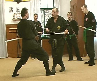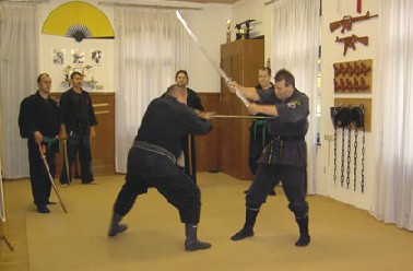 Der letzte Teil galt dem Ninpo-Biken-Jutsu, den Schwertkampftechniken der früheren Ninja des alten Japan. Hier werden aber nicht nur Schwerttechniken geübt. Vielmehr zählt die Gesamtheit der Techniken in Verbindung mit Improvisation und Täuschung zu diesem umfangreichen Teil des Bujinkan-Budo-Taijutsu / Ninjutsu. So kamen im alten Japan bei den Ninjas oft Blendmittel zum Einsatz, die zum Beispiel in Nussschalen oder der Saya (Schwerthülle) versteckt waren. Natürlich lässt sich im Training der Einsatz solcher Mittel nicht realisieren. Aber mit einer Papierkugel oder irgendeinem anderen zum üben geeigneten Gegenstand kann man diesen Effekt leicht simulieren. Dieses Ablenken des Gegners durch Zuwerfen bzw. Blenden waren in der Regel die entscheidenden Techniken, die zum Sieg führten. Den edlen Samurai (Kriegerkaste des mittelalterlichen Japan) waren mitunter solche unehrenhaften Techniken fremd. Während sie im fairen Kampf Mann gegen Mann ihre Ehre als das höchste Gut betrachteten, galt für die Ninjas in der Regel nur das Ziel, zu dessen Erreichen jeder Weg und jedes Mittel recht waren. So entstand ein Schwertkampf, der sich deutlich vom Ken-Jutsu (Schwertkampf) der Samurai unterscheidet, obwohl er zum Teil gleiche Techniken beinhaltet.