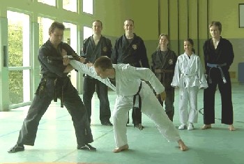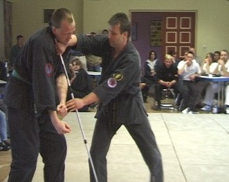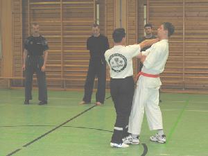 Parallel dazu unterrichtete Ralf Kürschner Anti-Terror-Karate. Hier standen Techniken im Vordergrund, die den Angreifer schnell Kampfunfähig machen und in eine für nachfolgende Transporttechniken günstige Lage brachten. Auch die Transportgriffe und ihre Einsatzmöglichkeiten waren Bestandteil dieser ersten Einheit. Im zweiten Teil kam der Tonfa und der Polizeischlagstock zum Einsatz. Nach einigen Grundschlägen und Stößen wurde mit dem Tonfa am Partner gearbeitet. Aufbauend an die vorangegangene Einheit konnten die Teilnehmer unter der Anleitung von Ralf Kürschner die zuvor gelernten Techniken nun in Verbindung mit dem Tonfa umsetzen. Zum Abschluss zeigte Kürschner noch einige Beispiele, wie der Tonfa bei Polizei und Sicherheitsfachkräften eingesetzt wird. So kann man damit beispielsweise den Angreifer am Ziehen einer Pistole hindern oder zwei Tonfas als Steighilfe beim überwinden eines hohen Maschendrahtzauns einsetzen.