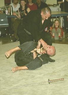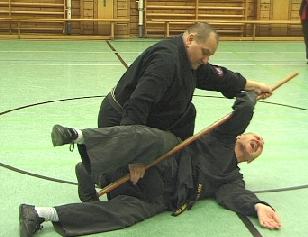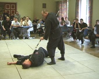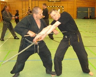 Am nächsten Morgen ging es weiter. Bujinkan-Budo-Taijutsu mit Wolfgang Gröger stand auf dem Programm. Diese alte Kriegskunst der früheren Ninjas ist so vielseitig, dass ein Menschenleben nicht ausreicht, um sie vollständig zu erlernen. Trotzdem finden die Teilnehmer der Kurse von Wolfgang Gröger immer wieder Techniken, Ideen und Anregungen, die sie mit in ihr zukünftiges Training einflechten können. Diesmal standen Techniken mit dem Bo auf dem Programm. Der Bo wurde in diesem Seminarteil nicht nur als Verteidigungswaffe eingesetzt. Vielmehr setzen mehrere Angreifer ihren Bo gemeinsam ein, um beispielsweise einen Verteidiger am Boden festzulegen oder seinen Hals mit vier um den Verteidiger stehenden Angreifern zwischen den 4 Bo’s einzuklemmen (dies war früher u. a. auch eine Transporttechnik). Dabei galt es, sich als Verteidiger mittels Körpereinsatz aus dieser misslichen Lage zu befreien und dann die Gegner zu überwältigen. Im zweiten Teil unterrichtete Wolfgang Gröger das sogenannte Ninja-Biken, die speziellen Schwerttechniken der früheren Ninjas. Hierbei legte er viel Wert auf das richtige Verständnis der Techniken und den jeweils notwendigen Körpereinsatz, der den Techniken die ungeheure Effektivität und Kraft verleiht. Auch das Einbauen von Täuschungselementen, um den Schwertkampf für sich zu entscheiden, waren Teil dieser übungseinheit.