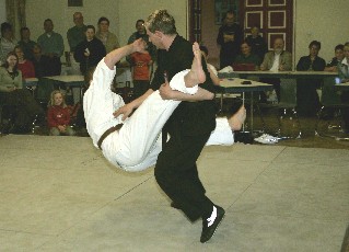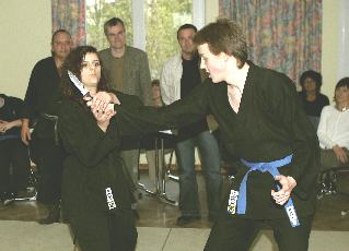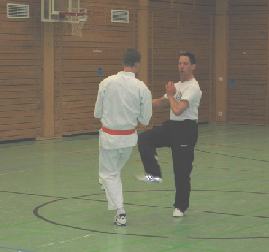 Danach zeigte Martin Ashauer (Trainer für Kickboxen an der Uni Bayreuth und Student der Uni, ebenfalls ein Schüler von Wolfgang Gröger) mit Christian Zenkel (auch ein Gröger-Schüler) einen Kickboxkampf im Leichtkontakt mit Schutzausrüstung um Verletzungen zu vermeiden.