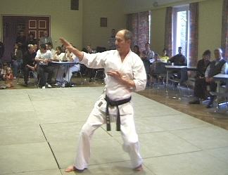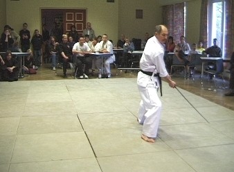 Zum Schluss zeigte Vice-Präsident Walter Neubauer (Shihan 9.Dan) zwei Bruchtests der Superlative. Zunächst zertrümmerte er zwei übereinander gelegte Ziegelsteine mit dem Handballen. Anschließend schlug er mit der Hand von oben auf die Öffnung einer mit etwas Wasser gefüllten Glasflasche und brachte diese damit zum Zerplatzen. Diese letzte Vorführung ließ unter den Zuschauern Ausrufe der Begeisterung laut werden.