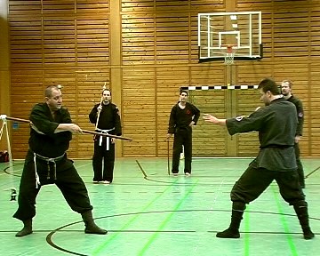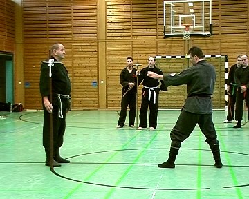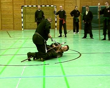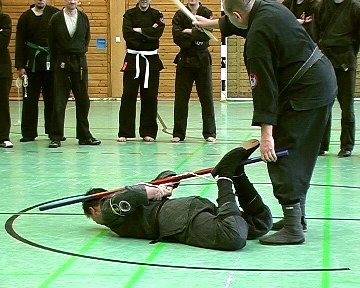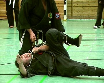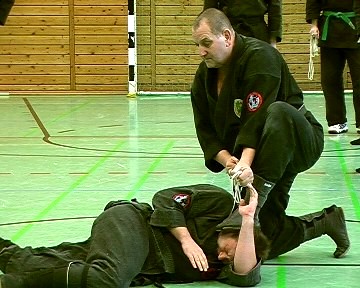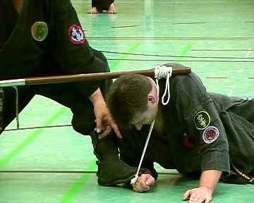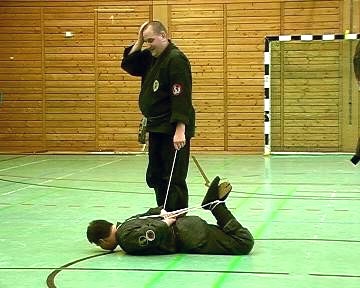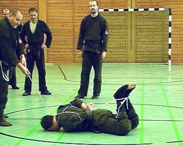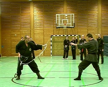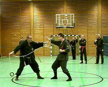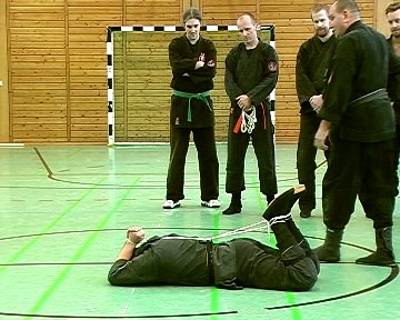 Nach einer kurzen Pause wurde dann Hojo Jutsu unterrichtet. Dabei erlernten die Teilnehmer den Umgang mit dem Seil. Das Seil kann man neben der Funktion als Fessel- und Kletterinstrument auch zum Kampf einsetzen und sollte nicht unterschätzt werden. Hier wurden verschiedene Wurf- und Schleudertechniken geübt, sowie das Hebeln und Werfen mit Hilfe eines Seiles. Interessant ist hierbei sicherlich die Möglichkeit Hebeltechniken mit dem Seil zu fixieren oder den überwältigten Gegner mit Hilfe des Seils zu fesseln oder zu transportieren.