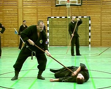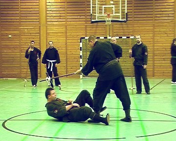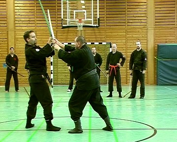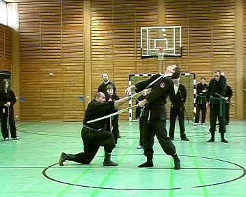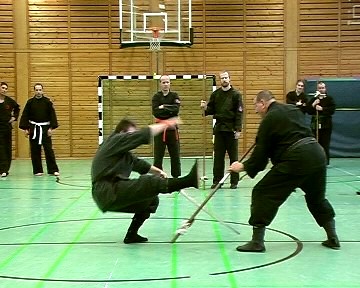 Im Anschluss an diese Techniken ging man zum Bojutsu über. Bo ist ein Langstab, der ungefähr in der Länge der eigenen Körperhöhe entspricht. In diesem Teil wurde ein Querschnitt aus Stoß-, Hebel- und Wurftechniken gezeigt, sowie die Handhabung des Bo gegen einen Schwertkämpfer. Dabei wurde im Vorgriff auf das Hojo Jutsu (Seiltechniken) auch das Bo in Kombination mit dem Seil benutzt, indem es z.B. um das Bo gewickelt wurde und das restliche Stück Seil am Ende beschwert wurde, um auch hier weitere Möglichkeiten für spezielle Techniken zu bekommen.