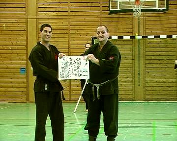 Während des Lehrgangs bekam Matthias Drumm, Leiter einer Sportschule in Landau, die von Dr. Masaaki Hatsumi Sensei ausgestellte Urkunde zum 1. Dan Budo-Taijutsu von Wolfgang Gröger überreicht. Wolfgang Gröger selbst, sowie der davon überraschte Jürgen Kampa, bekamen von den Schülern aus Jürgen Kampas Schule als kleines Dankeschön und Weihnachtsgeschenk jeweils einen mit ihren Namen bestickten Gürtel geschenkt, die darüber hinaus mit den japanischen Zeichen für IAWO bestickt waren.