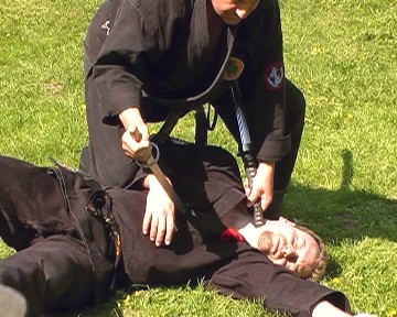 Hierbei übte Wolfgang Gröger einige Schwerttechniken u. a. aus Ninja-Biken und verschiedene Techniken mit dem Hanbo (Stock ca. 90 cm). Schwerpunkt waren dabei die Umsetzung verschiedener waffenloser Techniken in sinnvolle und traditionelle Techniken im Umgang mit den verschiedenen Waffen. Abschließend demonstrierte er noch einige Variationen im Umgang mit dem Shoge, der ehemaligen Lieblingswaffe der Ninjas, einer besonders geformten Waffe mit daran befestigtem langem Seil und einem Ring aus Metall und dem Kunai, einer ungeschliffenen Metallplatte in Form eines Wurfmessers, die eine sehr scharfe Spitze hat. Wolfgang Gröger benutzte diese Waffen zum Werfen und zeigte eine Vielzahl Verteidigungstechniken gegen Schwert- und waffenlose Angriffe teilweise mit abschließendem Fesseln des Angreifers.