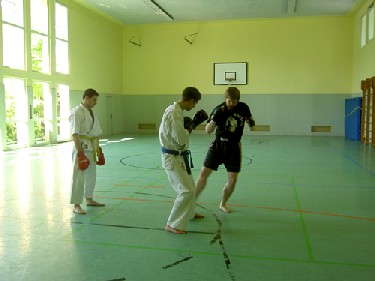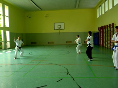 Rüdiger Schmiedel (Shihan 6. Dan) übte mit seinen Kursteilnehmern unterdessen eine Kata aus dem traditionellen Karate und demonstrierte anschließend die einzelnen Elemente daraus als kampftaugliche Partnerübungen.