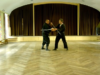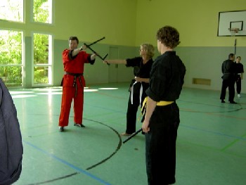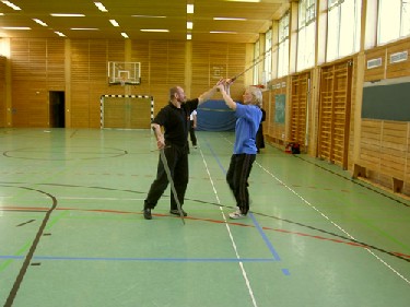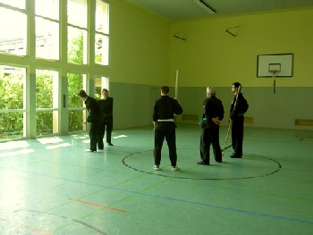 In dieser Einheit demonstrierte Wolfgang Gröger zunächst Techniken ohne Waffen und ging danach direkt zum üben mit dem Schwert über. Hierbei nutzten die Teilnehmer nicht nur die Schwertklingen, sondern führten auch Stosstechniken und Hebel mit dem Schwertgriff aus.