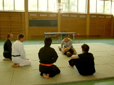 In den nachfolgenden Trainingseinheiten unterrichtete David Müller Techniken für den sportlichen Bodenkampf. Der ehemalig sehr aktive Kämpfer in Boxen, Kickboxen und Freefight zeigte den übenden schwerpunktmäßig Hebel- und Weiterführungstechniken, die zur Aufgabe des Gegner führen.